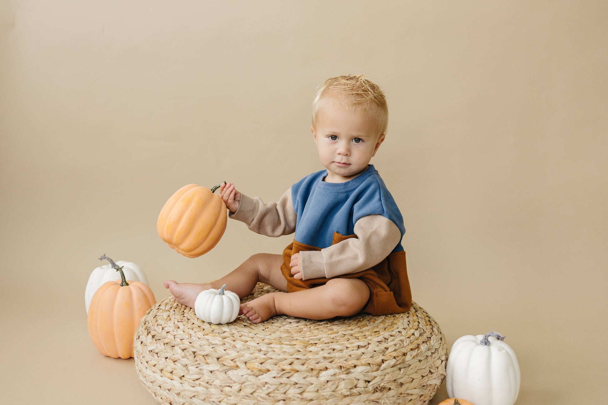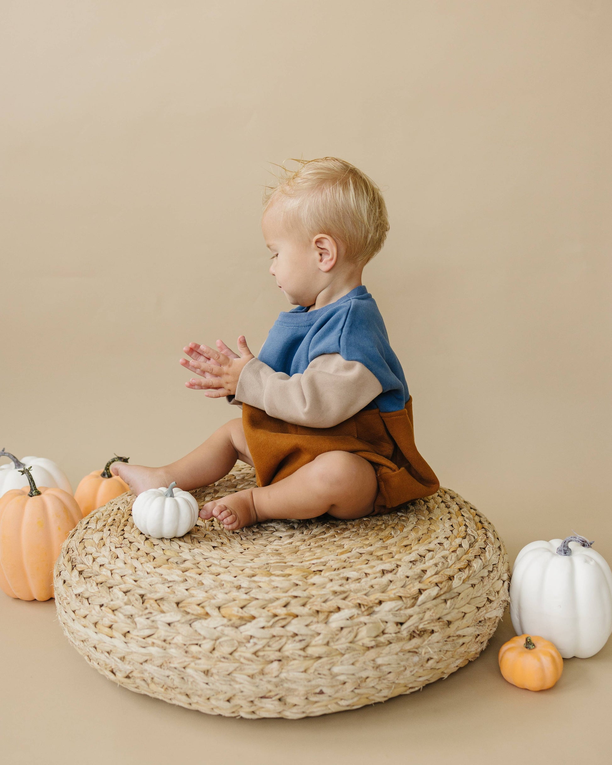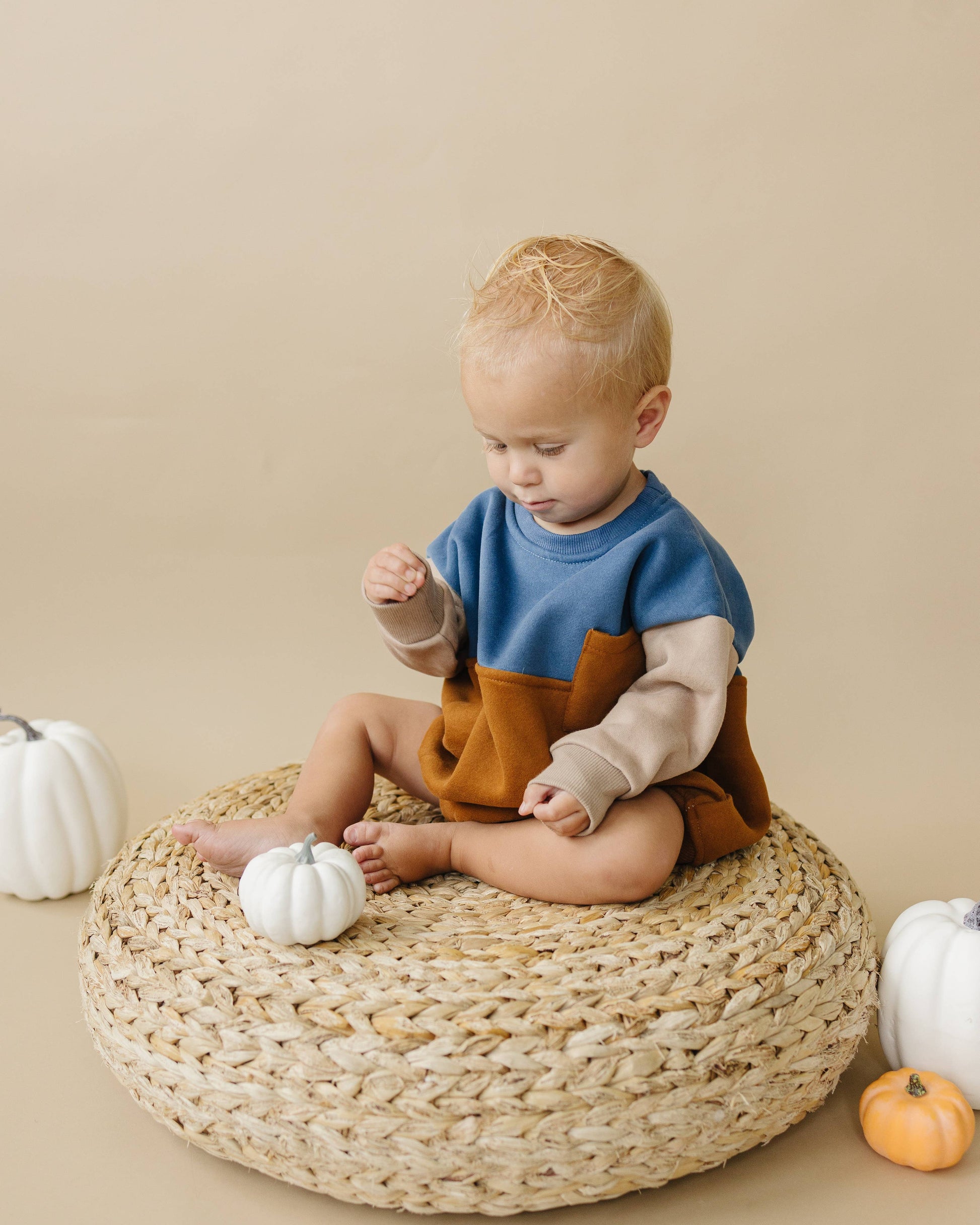 Embrace autumn vibes with this cozy and stylish oversized sweatshirt romper. Featuring a convenient snap closure at the crotch, it guarantees easy dressing and diaper changes. The charming fall themed color blocking design ensuring a solid style for boys and girls this fall!